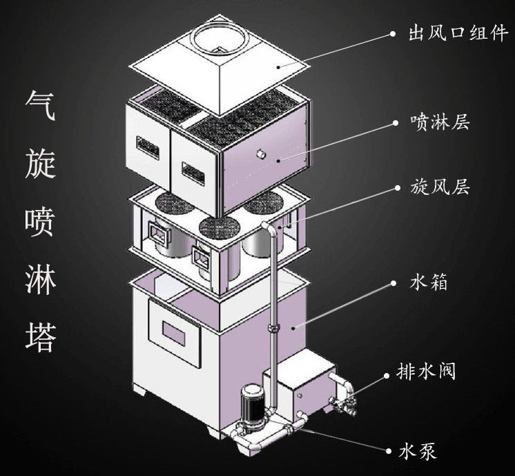 3、气旋式喷淋塔设备体积小,地面和空间占用小,适用于室内和室外空间受限的场地;